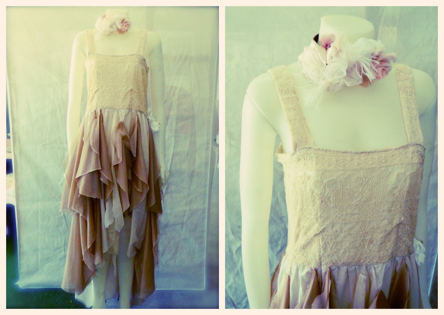 Anita used her own wedding dress from 1991 to create her entry. First she unpicked the sleeves and dyed them with coffee and beetroot and made them into fingerless gloves. The tulle was dyed first with tea, but unhappy with the resulting colour Anita then over dyed with cochineal to get the whimsical pinky grey. The satin underskirt from the original dress was 'hacked off' and made into the bubble underskirt, trimmed with vintage lace. The bodice was trimmed with vintage pompom edging and three longer pieces of the dyed tulle were added to the back. To complete the piece a vintage necklace was sewn to the neckline with the matching earrings added to the gloves to hang just over the ring finger and finally 'sporadic bling' was stitched to the rest of the garment.